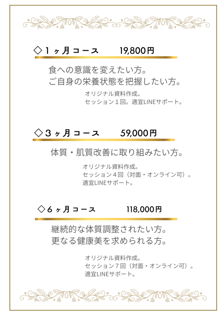 食からお身体を労り、情報に惑わされない健康美を本気で手に入れいたい方のみしっかり伴走させていただきます。中途半端なお気持ちの方はご遠慮ください。